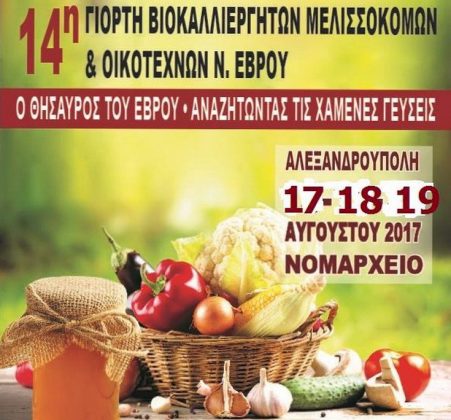 Η Περιφέρεια Ανατολικής Μακεδονίας και Θράκης – Περιφερειακή Ενότητα Έβρου συνδιοργανώνει με παραγωγικούς φορείς του Έβρου και της Περιφέρειας τη «14η ΓιορτήΒιοκαλλιεργητών – Μελισσοκόμων και Οικοτεχνών Γεωργικών Προϊόντων, Αναζητώντας τις χαμένες γεύσεις της Θράκης», στο ΝΟΜΑΡΧΕΙΟ στην Αλεξανδρούπολη, από την Πέμπτη 17, έως και το Σάββατο 19 Αυγούστου 2017.