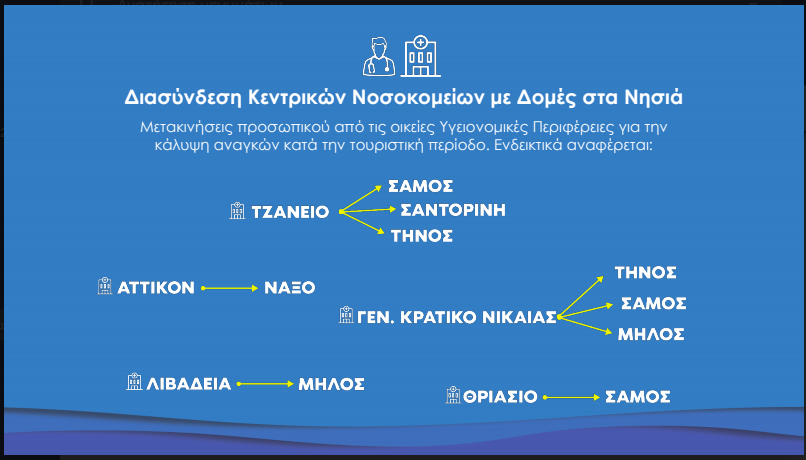 Ωστόσο, σε περίπτωση ανάγκης, οι ασθενείς θα διακομισθούν σε νοσοκομεία αναφοράς της ενδοχώρας. Όπως τόνισε ο κ. Κικίλιας, τα νησιά έχουν ήδη ενισχυθεί με γιατρούς και το προσωπικό είναι έτοιμο να αντιμετωπίσει οποιαδήποτε συνθήκη, καθώς έχει εκπαιδευτεί σχεικά.
