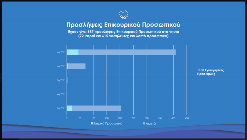 Τις υπηρεσίες τους στα νησιά θα προσφέρουν και 600 συμβεβλημένοι με τον ΕΟΠΥΥ γιατροί, ενώ στις δημόσιες δομές υγείας έχουν γίνει, ήδη, 687 προσλήψεις και συγκεκριμένα 72 γιατροί και 615 νοσηλευτές και έχουν εγκριθεί 1.100 νέες προσλήψεις.