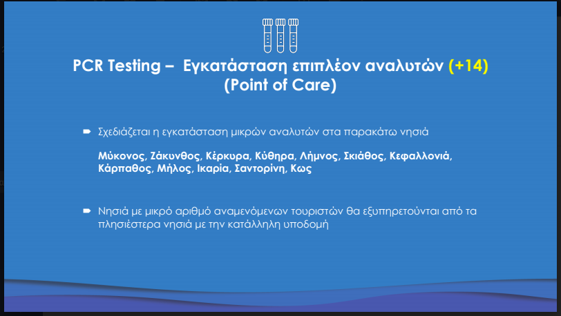 Για τις έκτακτες περιπτώσεις, θα αναπτυχθούν και τα μορισκά τεστ στα νησιά, και συγκεκριμένα στα εξής: Μύκονος, Ζάκυνθος, Κέρκυρα, Κύθηρα, Λήμνος, Σκιάθος, Κεφαλονιά, Κάρπαθος, Μήλος, Ικαρία, Σαντορίνη και Κως. Τα νησιά αυτά θα καλύπτονται από μοριακό αναλυτή.