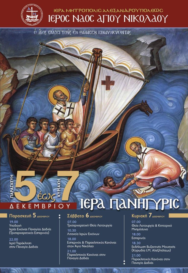 Την ερχόμενη Παρασκευή 5 Δεκεμβρίου το απόγευμα στις 7.00′ θα τελεσθεί στο Μητροπολιτικό Ναό μας ο μεγάλος Πανηγυρικός Εσπερινός της εορτής του Πολιούχου μας Αγίου Νικολάου. Πριν την έναρξη του Εσπερινού θα υποδεχθούμε την ιστορική εικόνα της Παναγίας της Δαδιάς, η οποία υπέφερε μαζί με τους προγόνους μας όσα υπέφερε ο Έβρος και ο τόπος μας στο πρόσφατο παρελθόν μας.